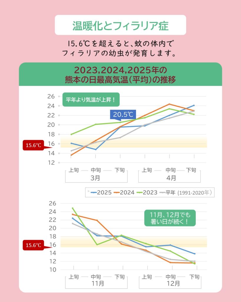 近年の平均気温の上昇により、蚊の発生時期が早まり、犬や猫のフィラリア感染のリスク期間が長くなっています。